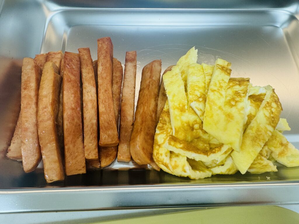스팸은 끓는 물에 2-3분 데쳐준다.(햄에 들어있는 첨가물이 제거됨)