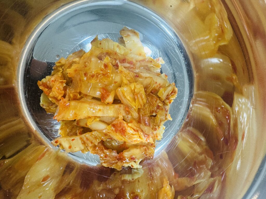 (갑자기 등장한 묵은지) 묵은지를 물에 씻고 물기를 꼭 짜서 설탕 조금, 참기름에 버무리고요.