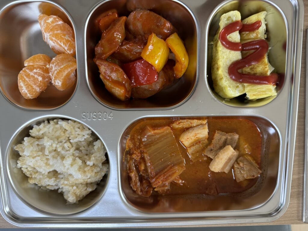 귤, 소세지야채볶음, 계란말이, 김치찌개